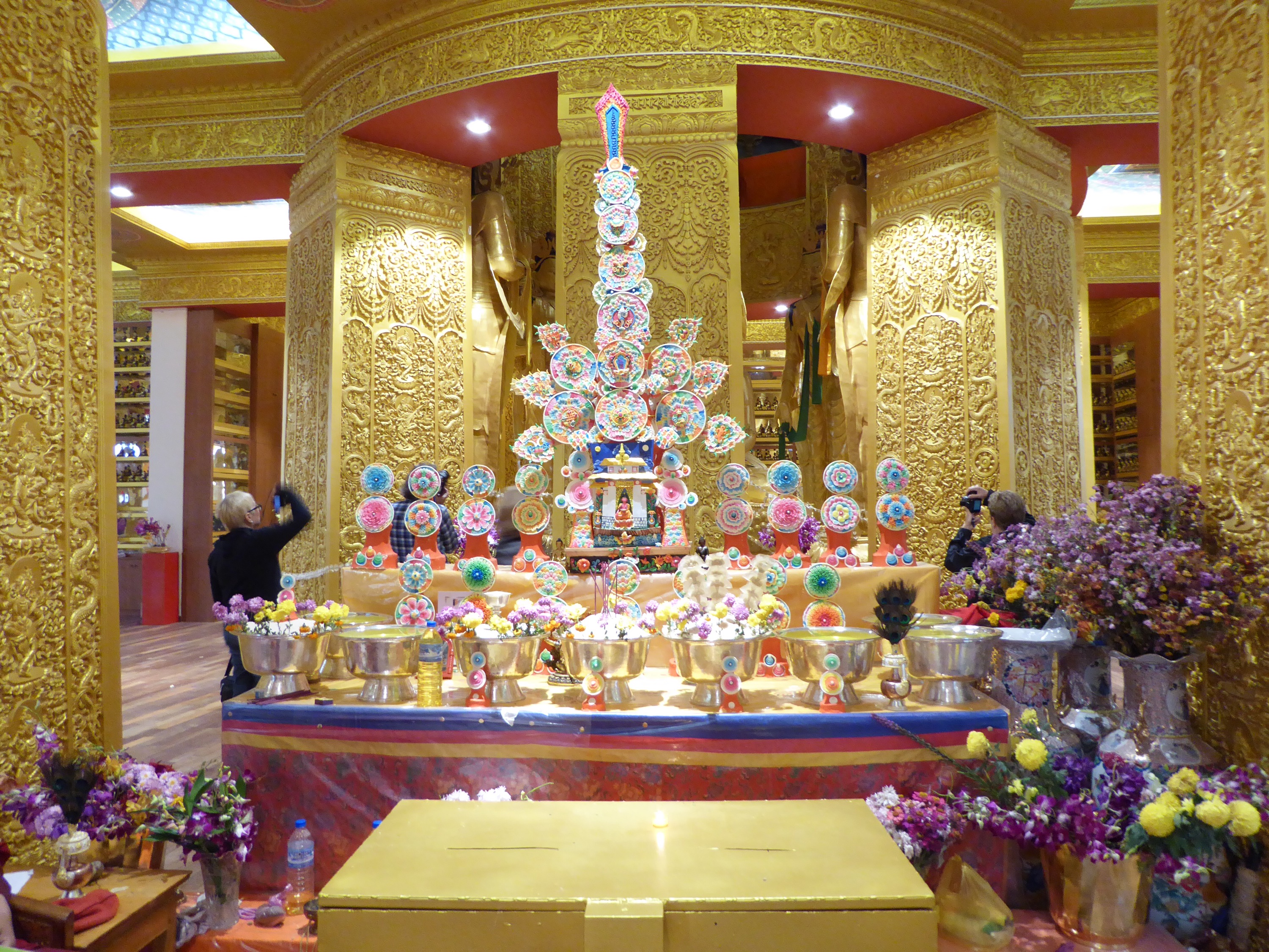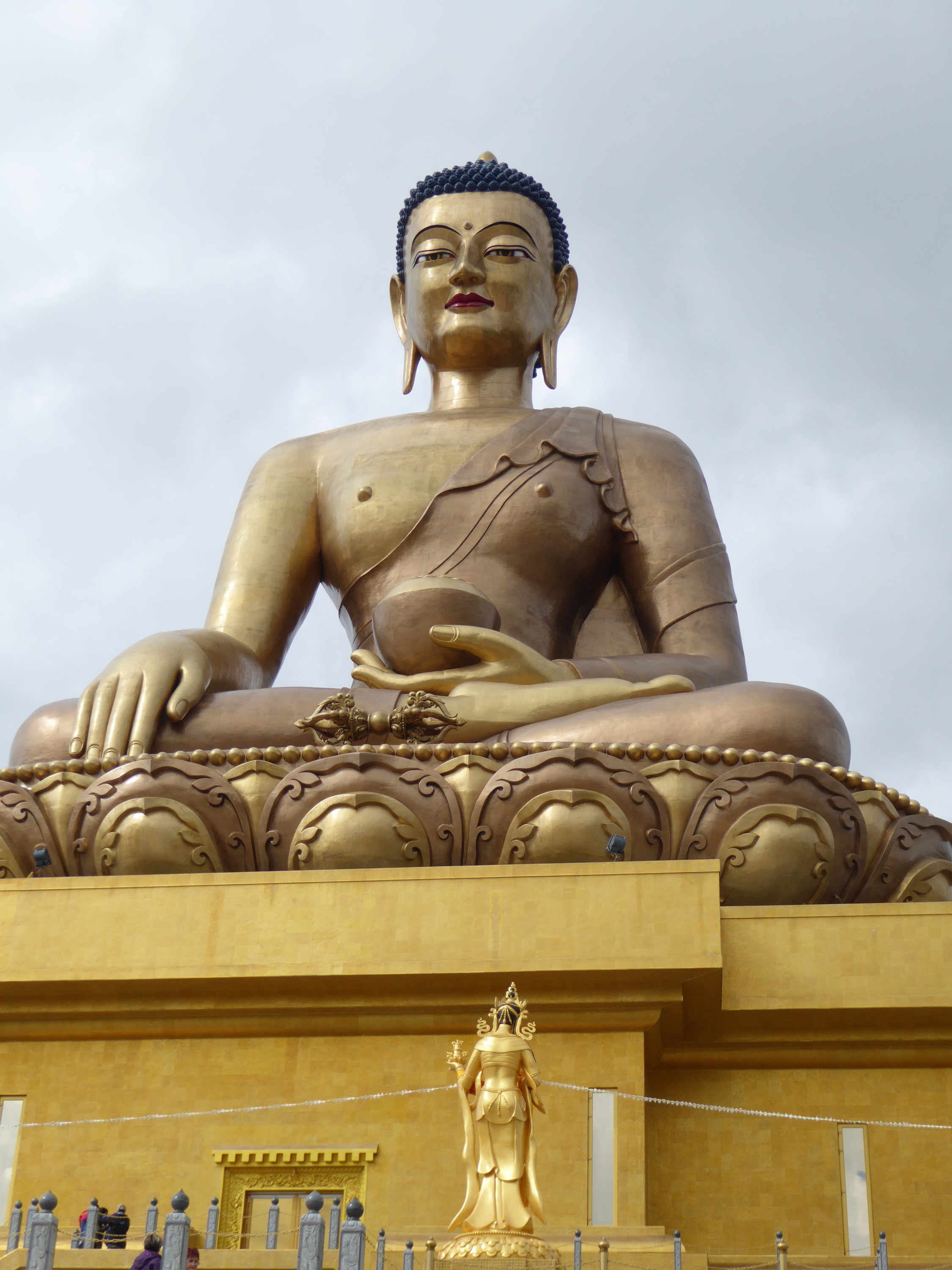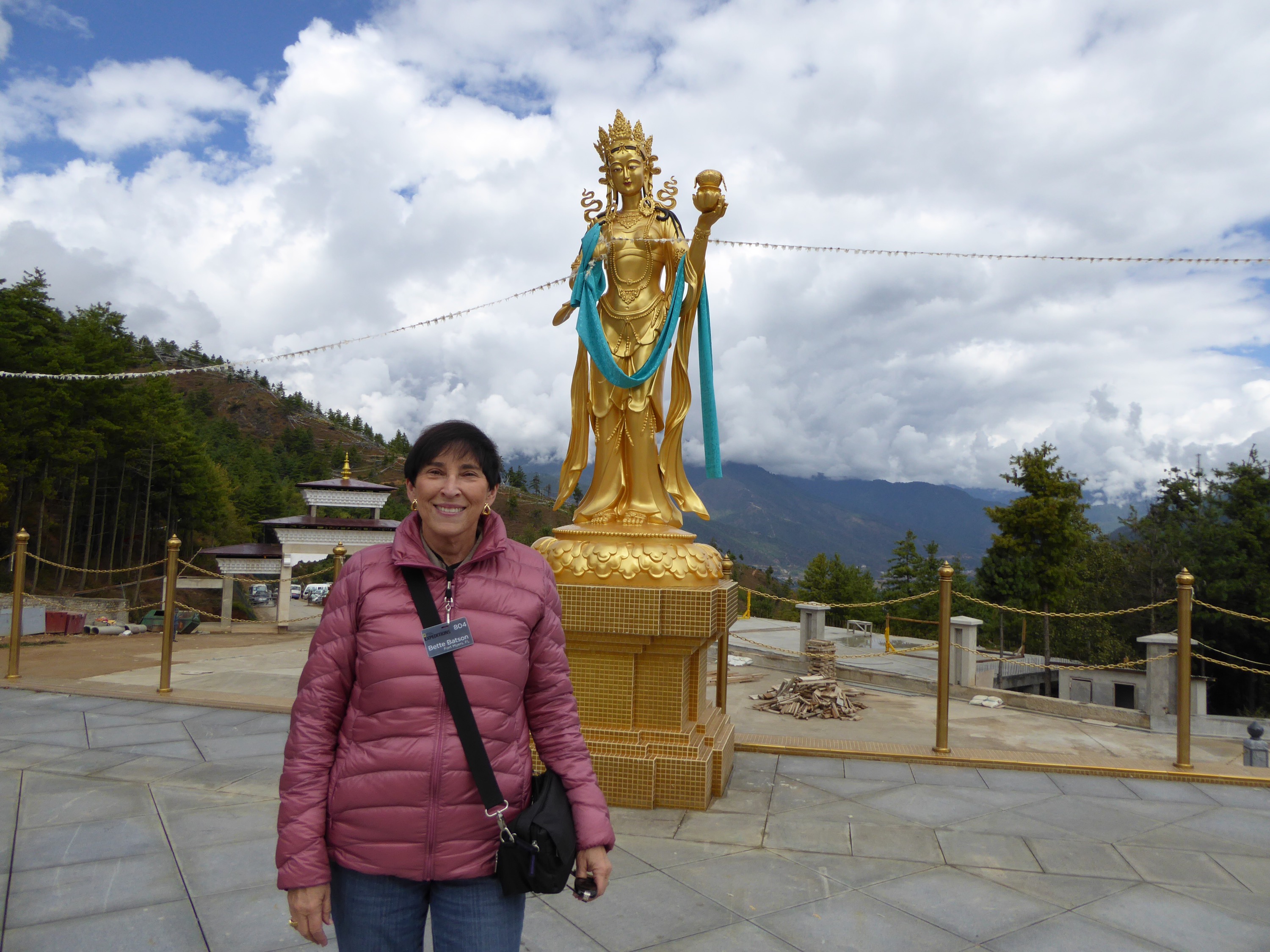 The first stop was to Buddha Point – think Christ the Redeemer in Rio but on a smaller scale. The Buddha is the a statue of Maitre or the future Buddha. It is still being built. The Buddha and the pedestal he sits on are complete but the terrace still has to be paved and the landscaping was not done at all. This site is on a hilltop which affords you a view of the capital town of Thimphu and the valley where Thimphu is located. The interior of the pedestal was covered in gold with beautiful mandalas painted on the ceilings. One of the paintings on the wall was the god you would pray to in order to be more accomplished musically. I said under my breath that it was too late for me, but my guide – an ever mindful believer – said it was never too late. I have not tried to sing since but will let you know if it worked. The enormous room in the pedestal will eventually hold 125,000 (no typo) Buddhas – 100,000 will be 8 inches tall and the remaining 25,000 will be 12 inches tall. We were offered a chance to purchase our own Buddha but declined. Currently there are 10,000 in place.