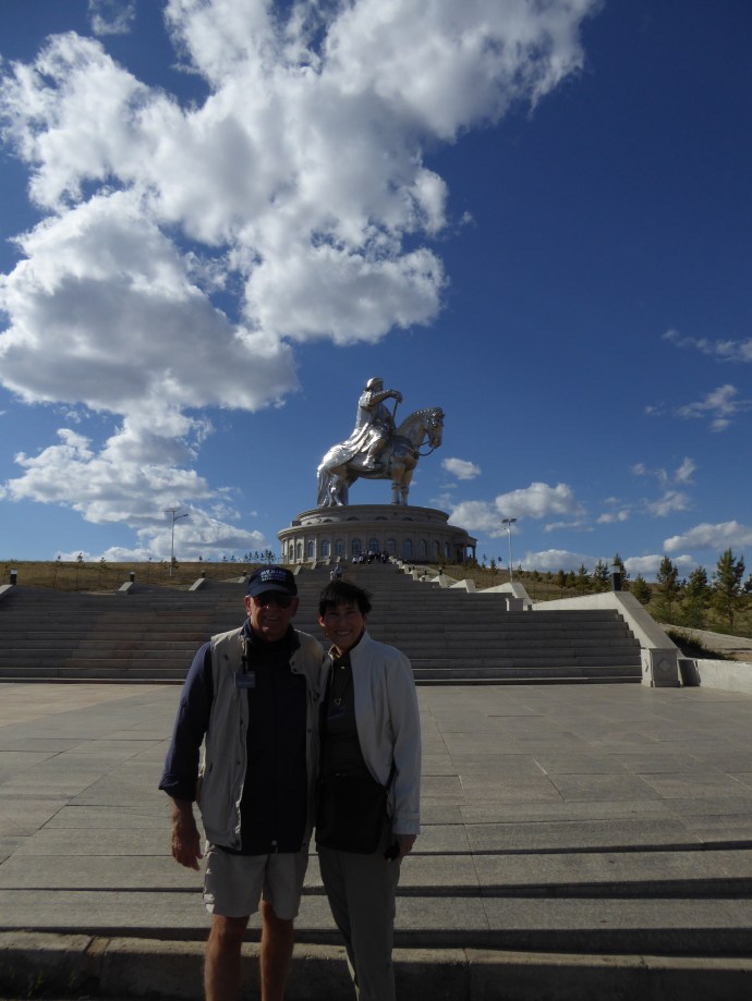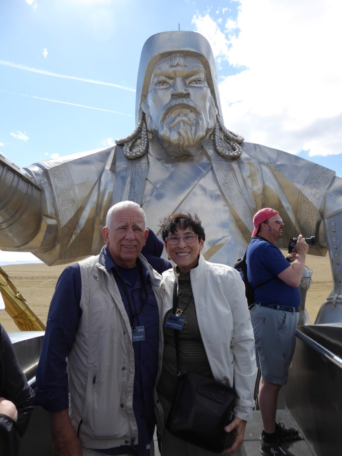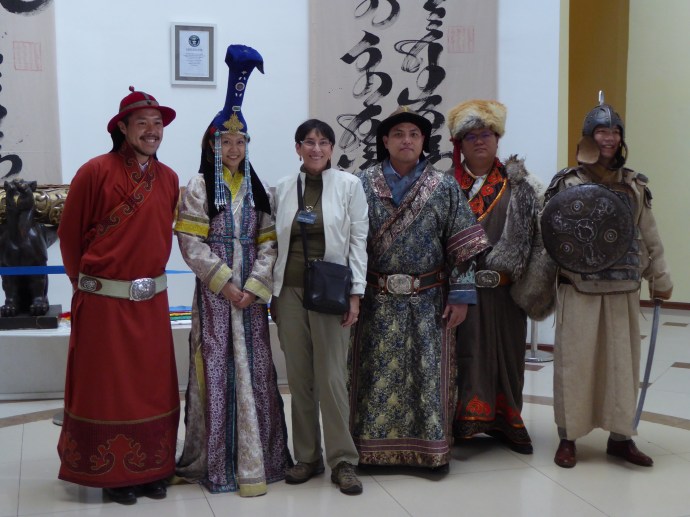 Our last stop for the day was at the Genghis Khan Statue complex.  We walked up stairs to a lookout point.  We could see the steppe and mountainside.  The statue is 131 feet tall and covered in 250 tons of stainless steel.  It was built by a local businessman to try to bring information about Khan to the world.  We also had a local historian give us a tour of the private collection museum in the basement level of the statue.  Bette talked her way into a photo with a group of young people dressed in traditional clothing.