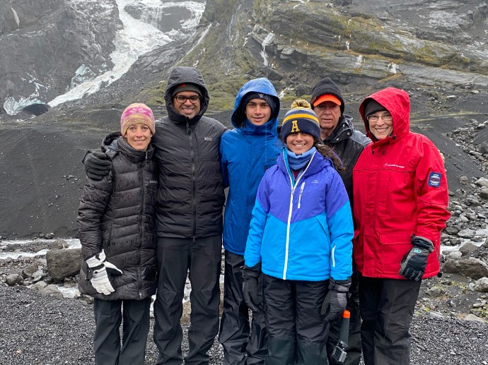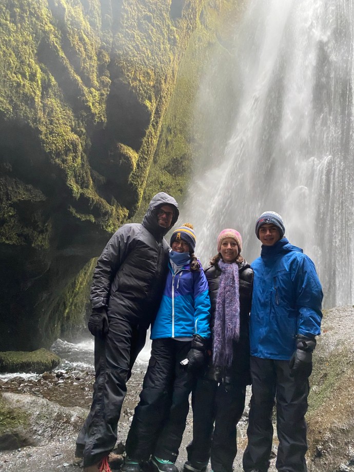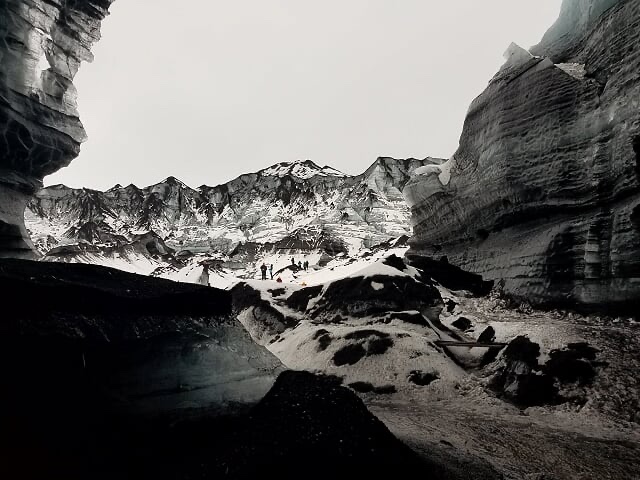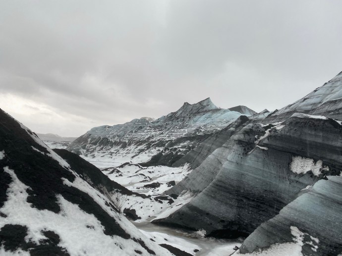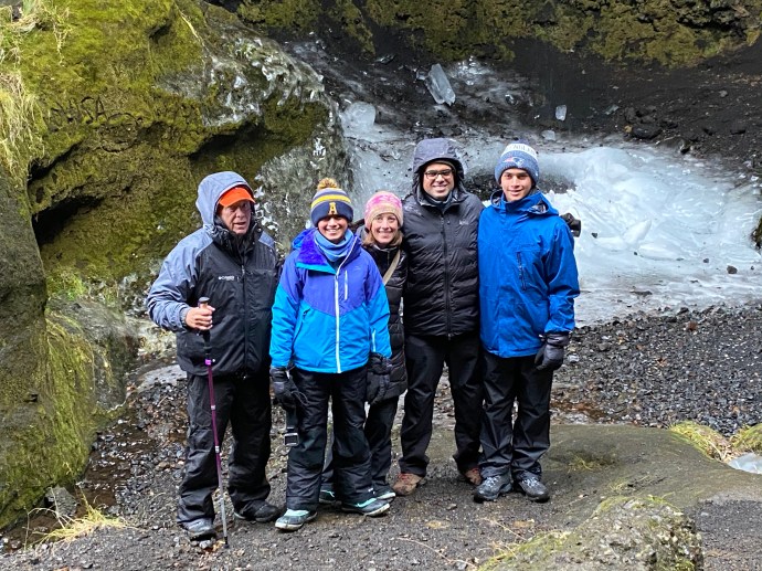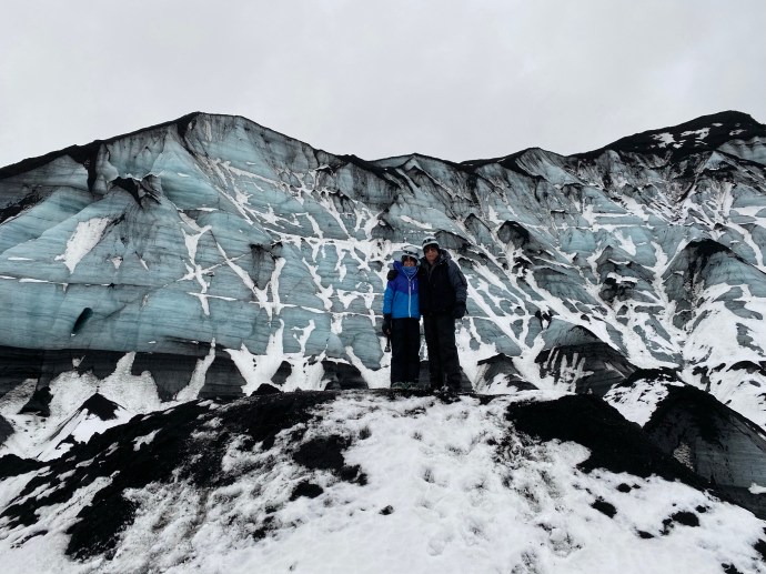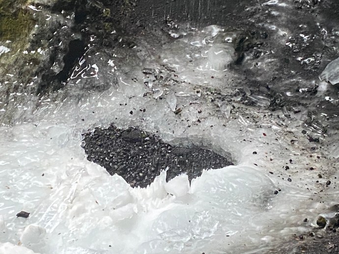 We toured with David (Icelandic name too hard to say) and we were going to ice caves. We drove for about 30 minutes out to the glacier. We were off road in one of the Super Jeeps but not as fancy as the one from the day before. We put on helmets and crampons and then walked about 15 minutes to get to the mouth of the cave. We had to walk through slush, over streamlets on wooden planks and then climb on ice. There were ropes to help. The ice was amazing, with the blues of glacial ice but with lots of black lava sand too.