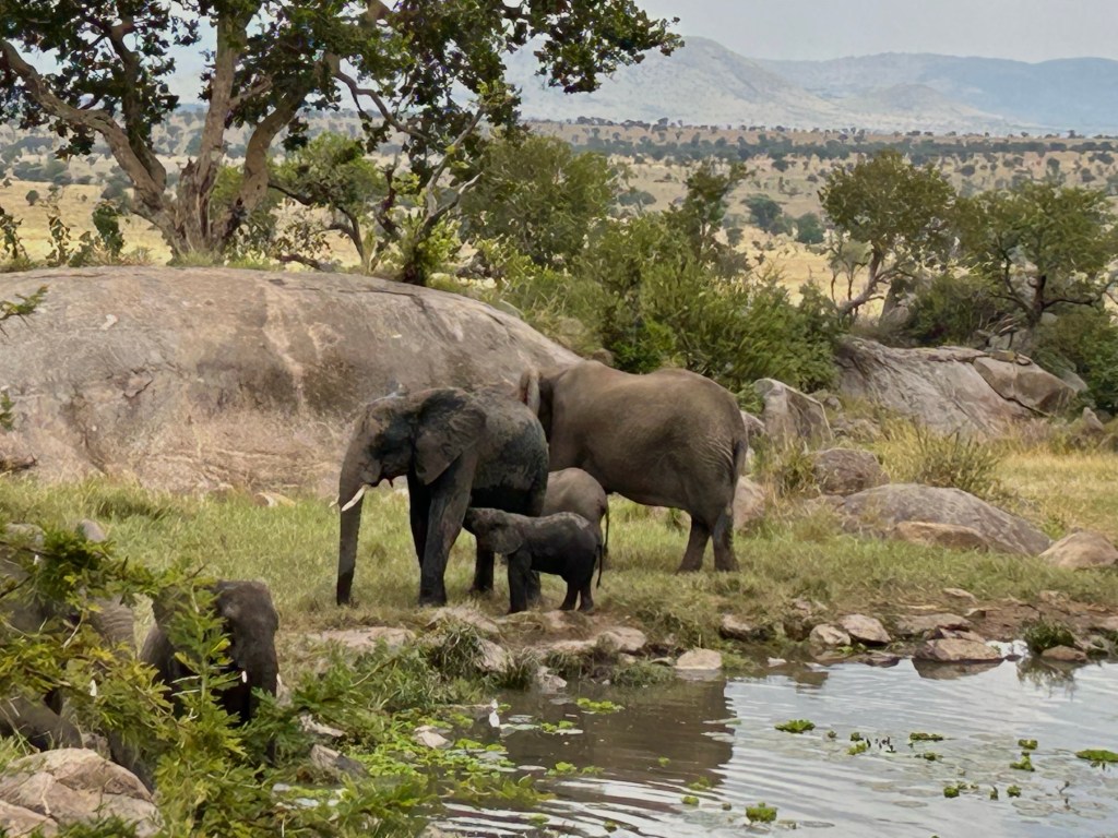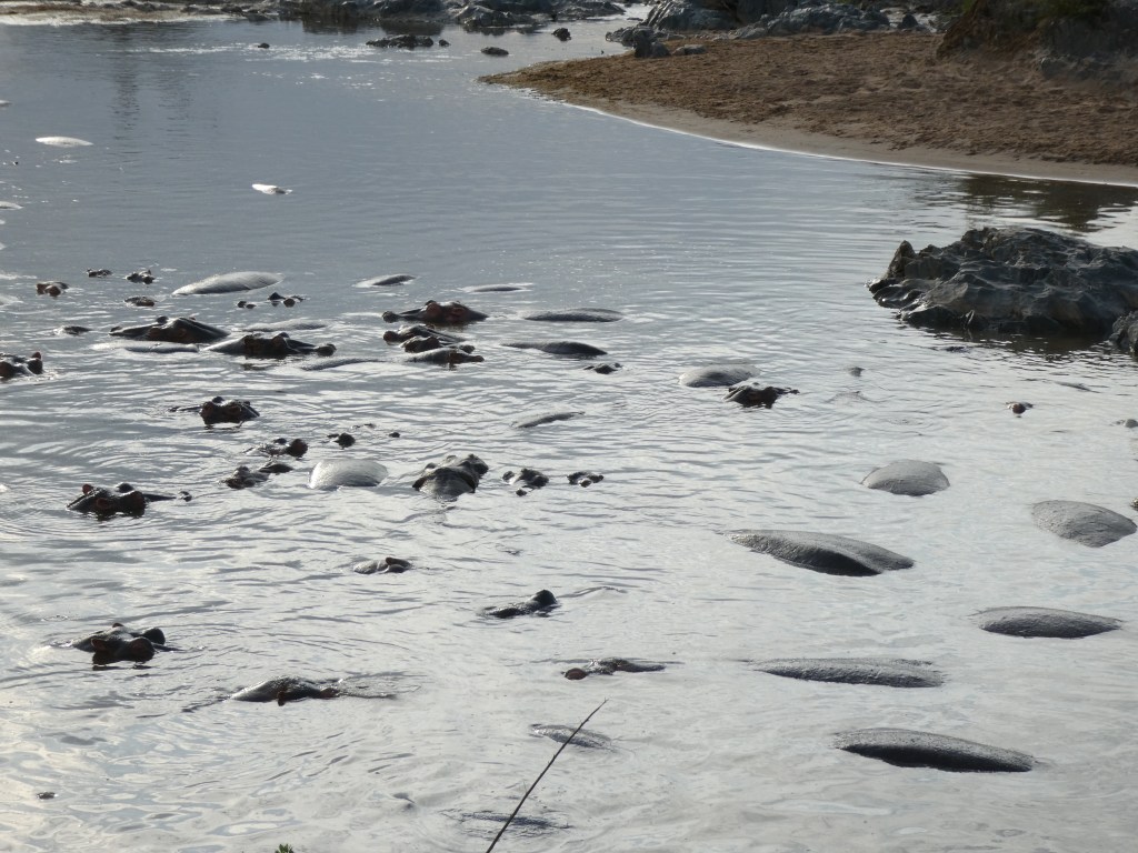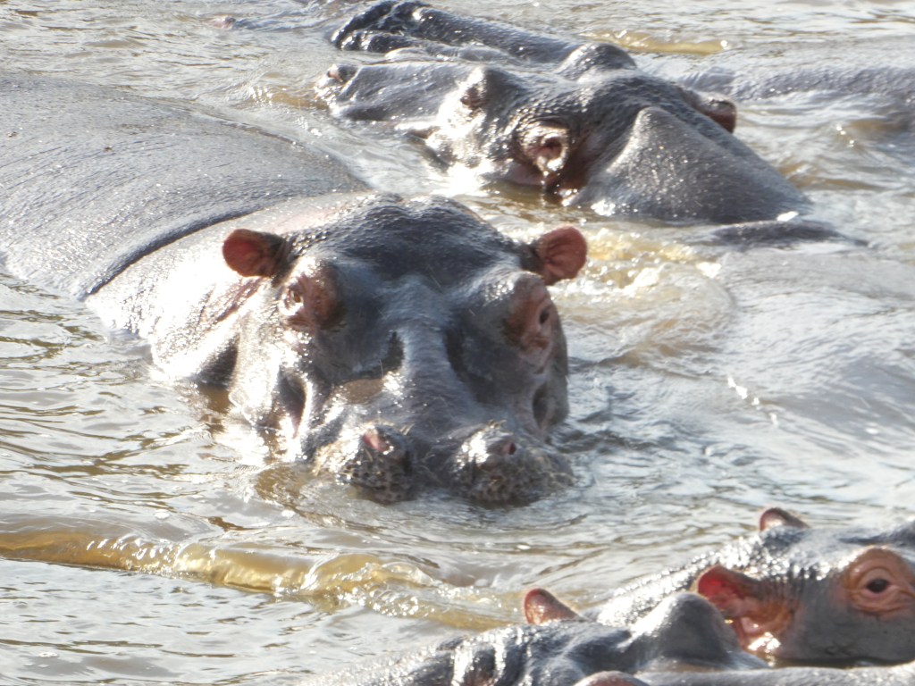 Descending toward ground level, our direction changed and our speed became more apparent, and we passed directly over a small herd of Zebras about 100ft (30m) below. Drifting gently along at treetop height, we passed by more Topis and several Giraffes. We came upon our first treat, a large beautiful Cheetah (along with her three cubs, walking through the short grass). Next, we passed by the Seronera Airstrip at 100ft (30m) above ground, another unique experience before climbing a little to set ourselves up for a âriver runâ along the mighty Seronera River. Everything came together nicely, and we dropped in above the first of four Hippo pools, which was the second treat of this morning. Then, out of nowhere, one of us pointed out a large, and very rare Leopard gliding along a path below the Palm Trees. Gorgeous and menacing all in one.