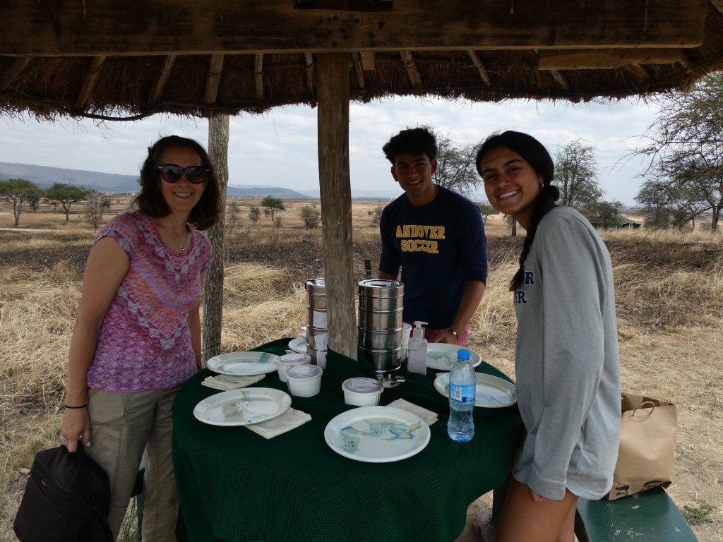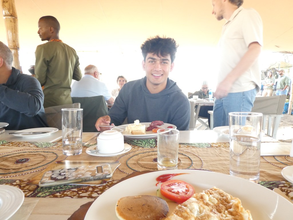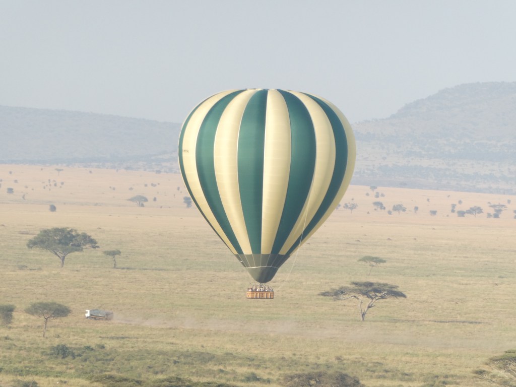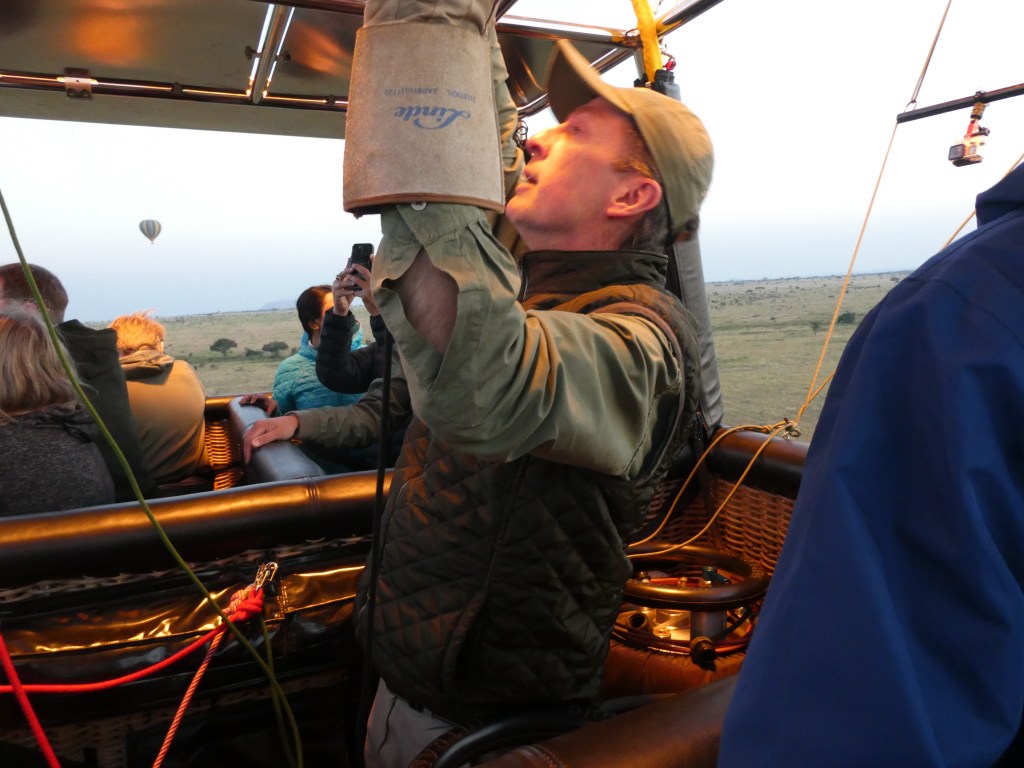 We then climbed, reaching a maximum altitude of 2,125ft (648m) above ground, while we enjoyed some fresh-brewed Tanzanian coffee from our little balcony in the sky. The view this morning was spectacular, an impressive 360-degree panorama, including a vague outline of the crater rim in the haze to the South-East that was shared with eight other balloons sprinkled across the sky, with the winds aloft taking us towards Makoma Hill, to the South at a leisurely 8 mph (14km/h).